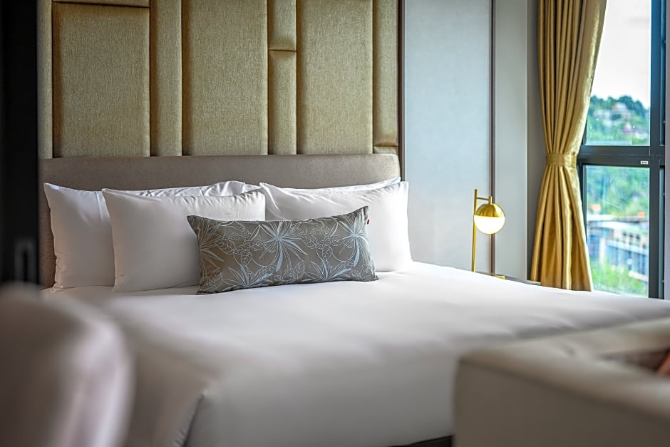 Deluxe Ocean View with Plunge Pool is 829 square feet and includes a king-size bed 150-183 width plus balcony, cable tv, hairdryer, ironing set, safe, bathrobes, and slippers.